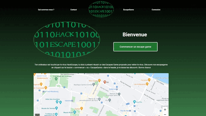 Hackescape est un site web qui propose des escapes games en ligne avec différents thèmes. Actuellement il y a un escape game de disponible qui est sur le thème de base du site qui est l'informatique et qui vous mets en plein milieu d'un piratage de vos données.